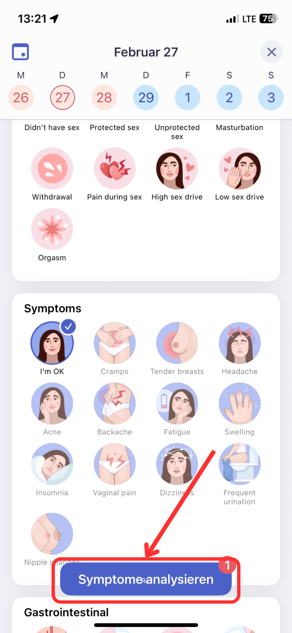Um Ihre Symptome zu bearbeiten, öffnen Sie einfach die Registerkarte Symptome und wählen Sie die Antworten aus, die Sie bearbeiten möchten. Tippen Sie anschließend auf 'Symptome analysieren'.