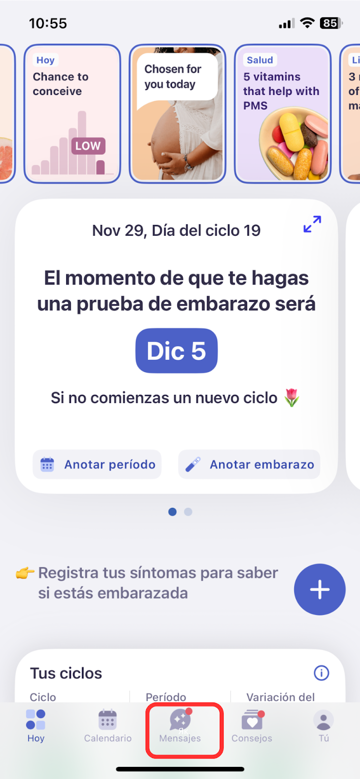 Utilizamos un ecosistema integral impulsado por IA con rápido acceso a información diaria personalizada de médicos que permite hacer predicciones precisas sobre el ciclo menstrual y la concepción. Además, recientemente hemos actualizado nuestra aplicación añadiendo una nueva función de chatbot para el modo Búsqueda de embarazo, que puede ayudarte a obtener aún más información sobre tu tema de interés:
