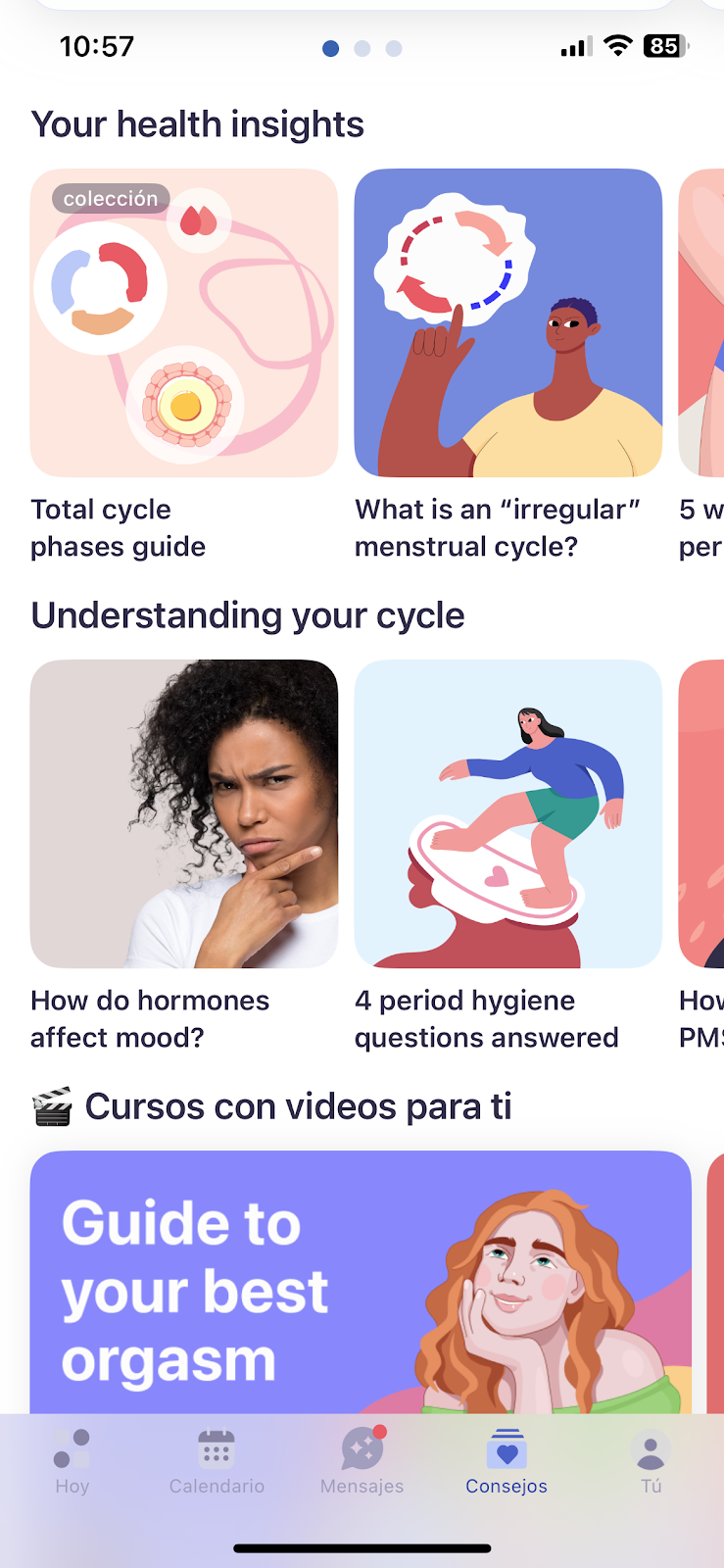 En el modo Monitor de ciclo, recibirás los cursos "Guía para alcanzar tu mejor orgasmo" y "Nutrición para perder peso de forma saludable".
