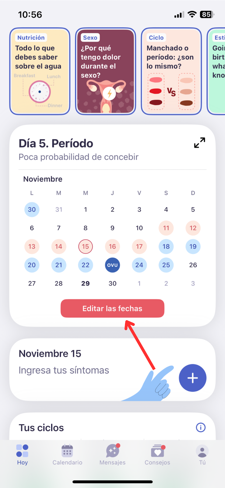 Femia te permite consultar las fechas actuales de tu ciclo menstrual, predecir la ovulación y realizar un seguimiento de los retrasos en tu menstruación. También puedes editar la información sobre tu ciclo pulsando sobre la fecha que deseas cambiar en el calendario (ver más abajo):
