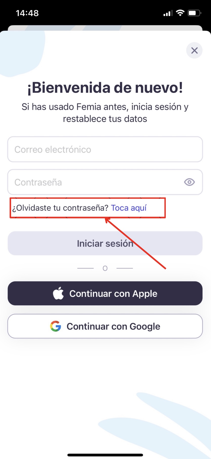 Si has utilizado tu correo electrónico y contraseña para registrarte en la app, pero has olvidado tu contraseña, toca en el enlace o hipervínculo de “Toca aquí” como se muestra en la siguiente captura de pantalla y sigue las instrucciones proporcionadas.