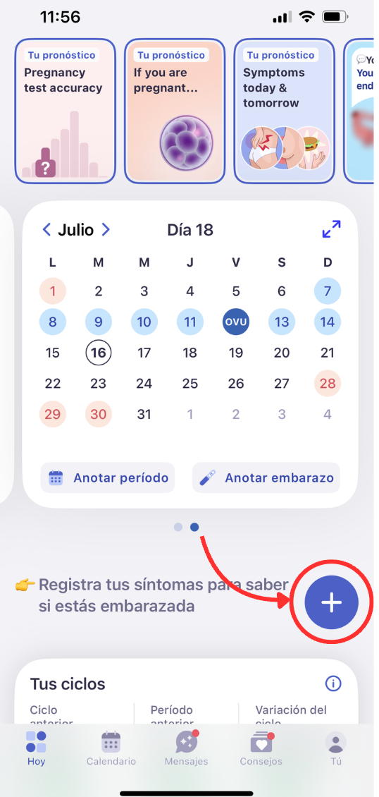 Para registrar tus síntomas, desplázate hacia abajo y pulsa el signo más (como se muestra a continuación):