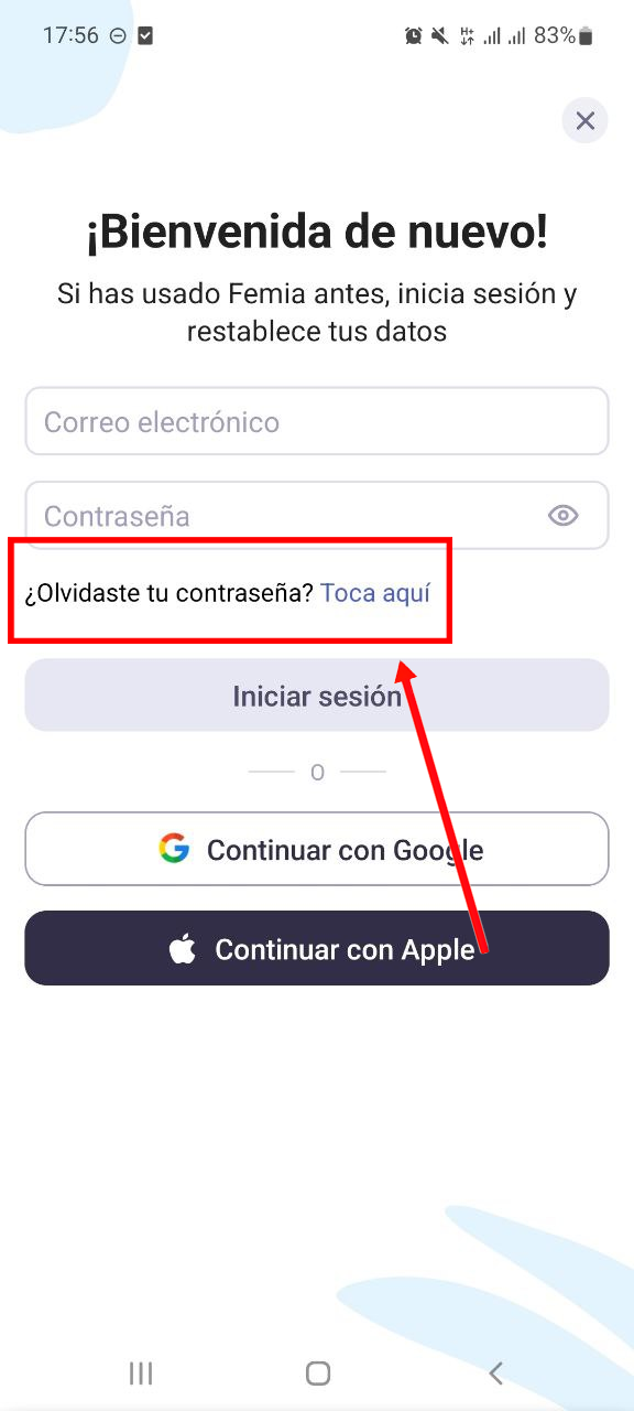 Si has utilizado tu correo electrónico y contraseña para registrarte en la app, pero has olvidado tu contraseña, toca en el enlace o hipervínculo de “Toca aquí” como se muestra en la siguiente captura de pantalla y sigue las instrucciones proporcionadas.