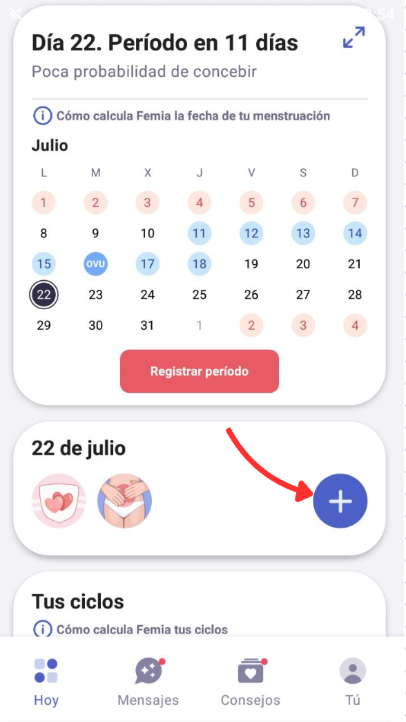 Para registrar tus síntomas, desplázate hacia abajo y pulsa el signo más (como se muestra a continuación):